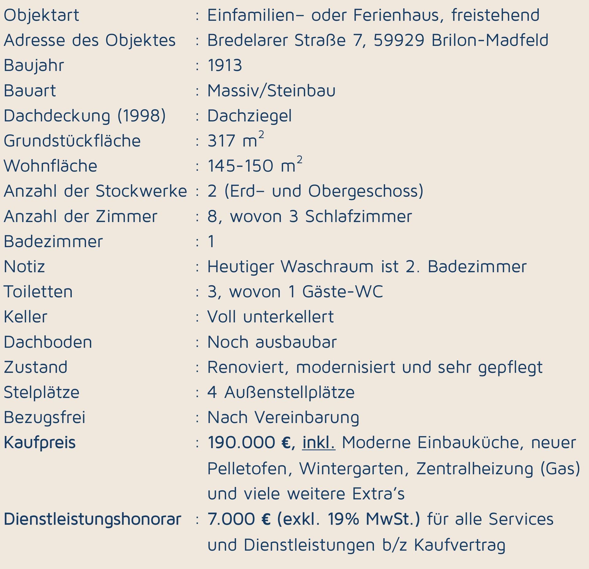 Gut zu wissen ist auch, dass dieses Haus einen Marktwert von 224.000 € hat. Die Eigentümer möchten in den Norden Deutschlands umziehen und bieten das Haus zu einem deutlich niedrigeren Preis von 190.000 € an. Selbst mit ca. 22.000 € Kaufnebenkosten bleiben Sie noch weit unter dem Marktwert. Ein attraktives Angebot, inklusive: eine moderne Einbauküche, neu ausgestattet mit allen Geräten, ein herrlicher Wintergarten aus weißem Aluminium mit Doppelverglasung für zusätzlichen Wohnkomfort, ein neuer Pelletofen zur Einsparung Ihrer Heizkosten, eine Zentralheizungsanlage (Gas) und viele weitere Extras, wie eine begehbare Dusche, ein begehbarer Kleiderschrank und vieles mehr.